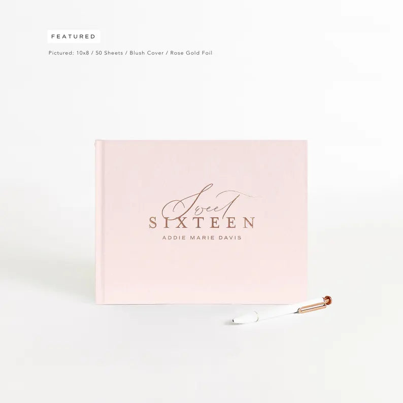 Mark her milestone birthday with elegance using this stunning Sweet Sixteen guest book. Featuring a soft blush cover and radiant rose gold foil lettering, it captures the beauty and joy of this unforgettable celebration. Perfect for friends and family to leave loving notes, warm wishes, and cherished memories that she’ll treasure for years to come. A lovely addition to any Sweet 16 party theme.