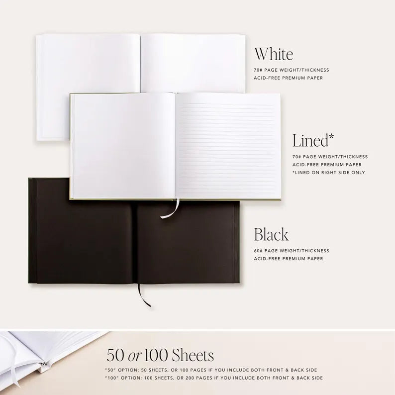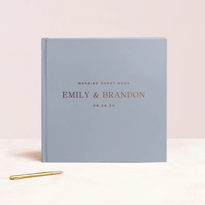 This understated yet elegant guest book features a calm, matte slate blue cover perfect for modern or sophisticated weddings. The clean design is personalized with chic, minimalist gold-foiled typography, highlighting the couple's names and wedding date. It offers a contemporary aesthetic that beautifully preserves the messages and well wishes from your celebration.