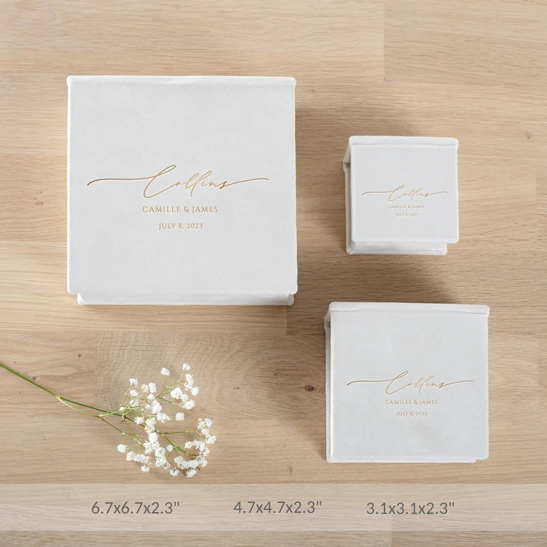 This beautiful square ring box features a rich, warm terracotta or burnt orange velvet covering, giving it a distinctive autumnal or rustic feel. The lid is personalized with the couple's names and wedding date in a simple, elegant gold-foiled font. This unique color adds a beautiful touch of warmth and texture, making it an ideal choice for fall or bohemian-themed ceremonies.
